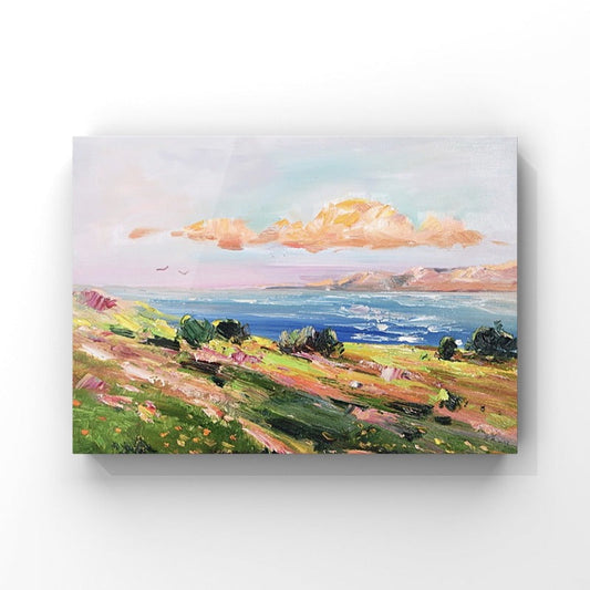 LANDSCAPE PAINTING, SUNSET COASTAL, HAND-PAINTED CANVAS