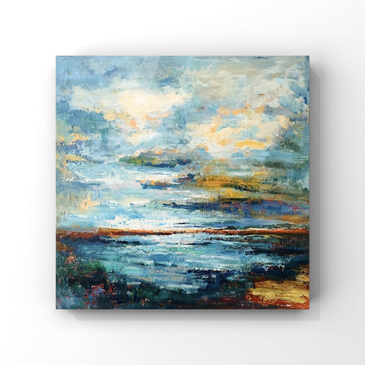 LANDSCAPES PAINTING, BLUE LAKE SIDE, HAND-PAINTED CANVAS