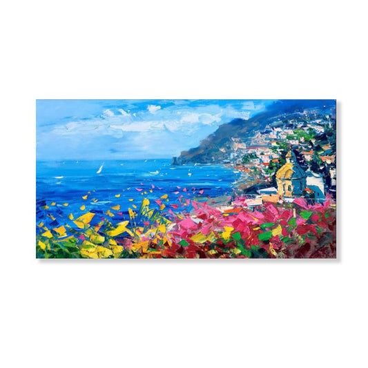 LANDSCAPE PAINTING, SEASIDE VILLAGE, HAND-PAINTED CANVAS