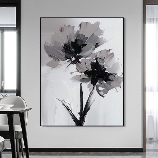 FLOWER PAINTING, HAND-PAINTED CANVAS, WHITE BLACK FLOWER