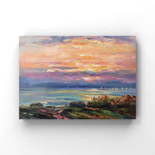 LANDSCAPE PAINTING, COASTAL BRIGHT LIGHTS, HAND-PAINTED CANVAS