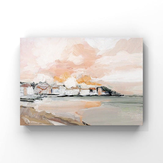 LANDSCAPE PAINTING, COASTAL CITY VIEW, HAND-PAINTED CANVAS