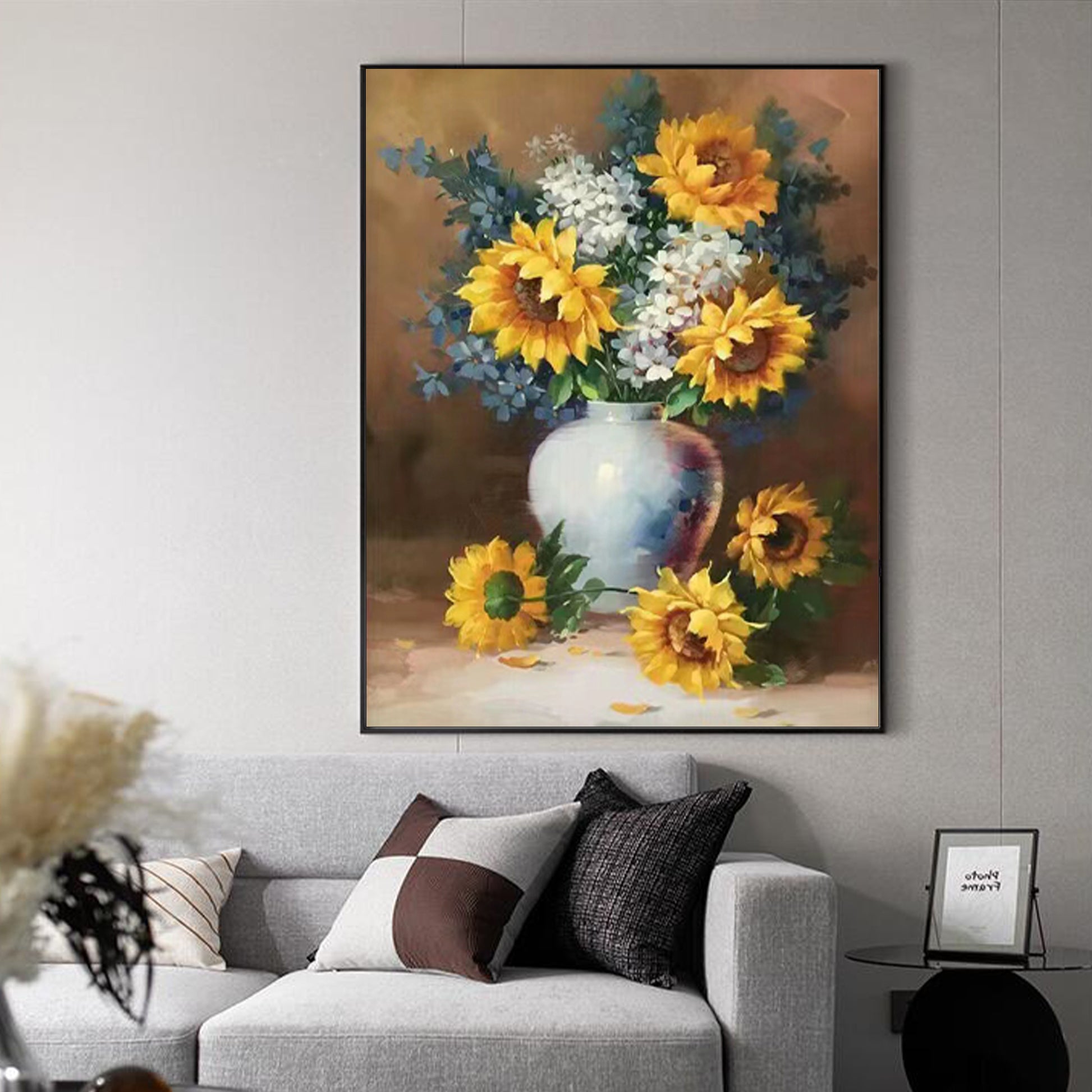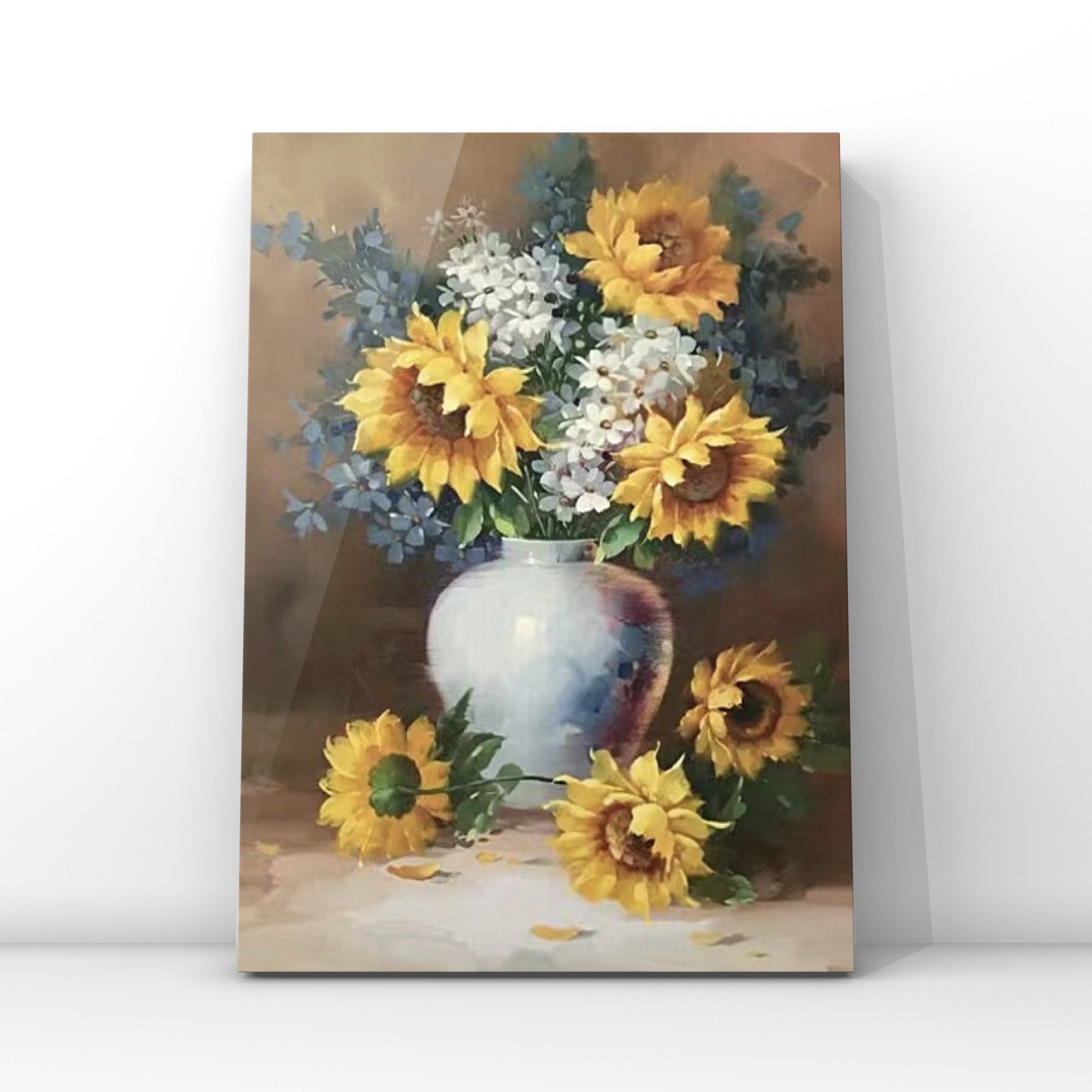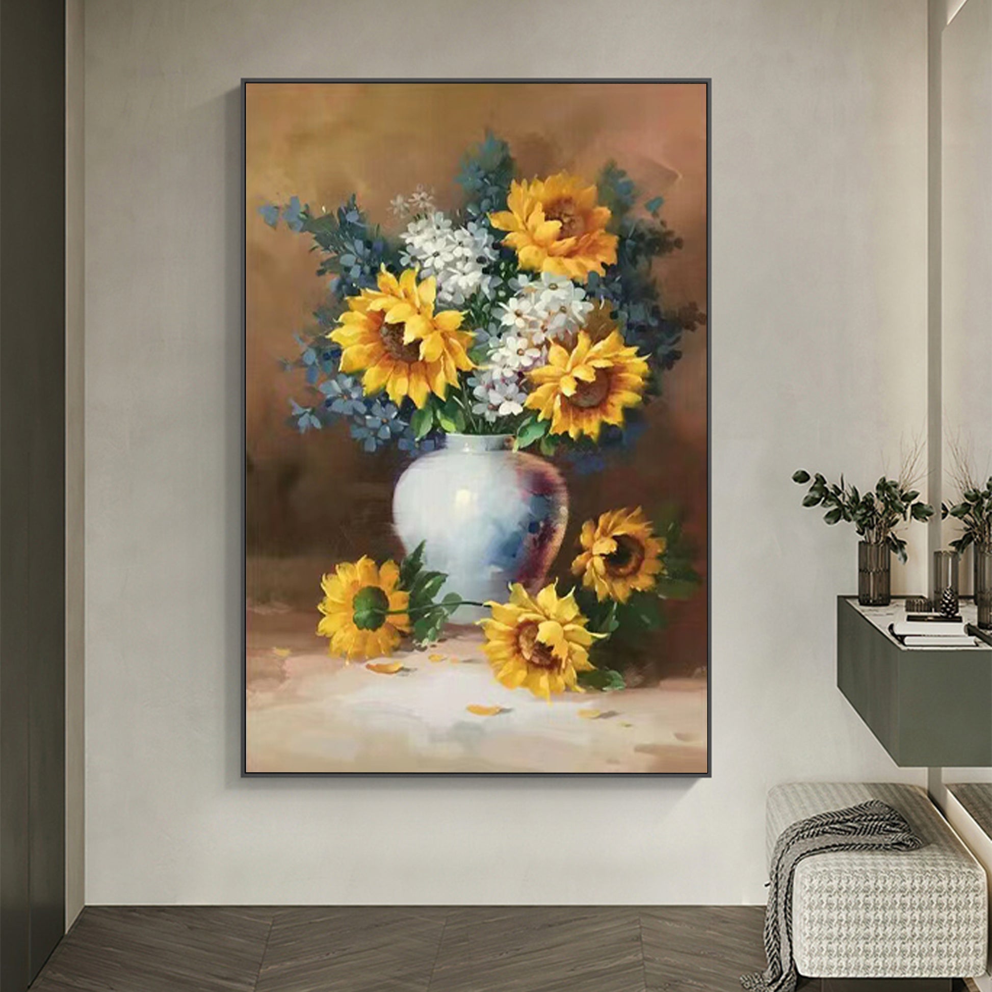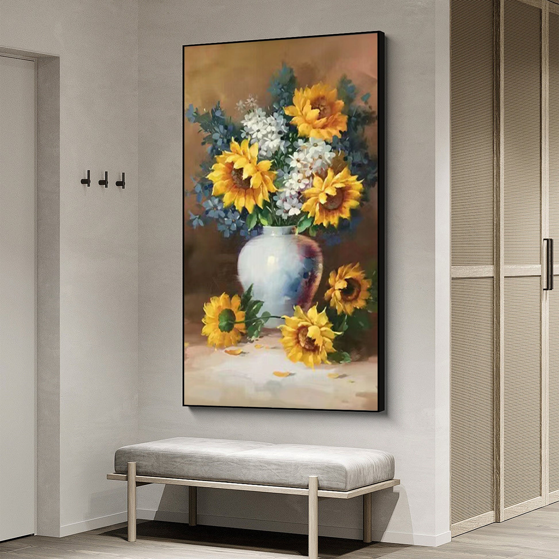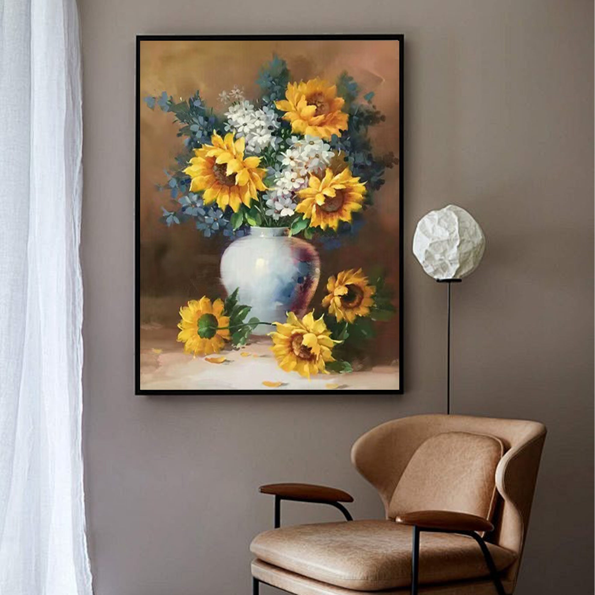 FLORAL PAINTING, CLASS SUNFLOWER, offers a masterful rendition of botanical elegance, meticulously portrayed on premium canvas. As a unique form of wall embellishment, flower paintings infuse interiors with the splendor of nature's palette, showcasing intricate details and vibrant colors.