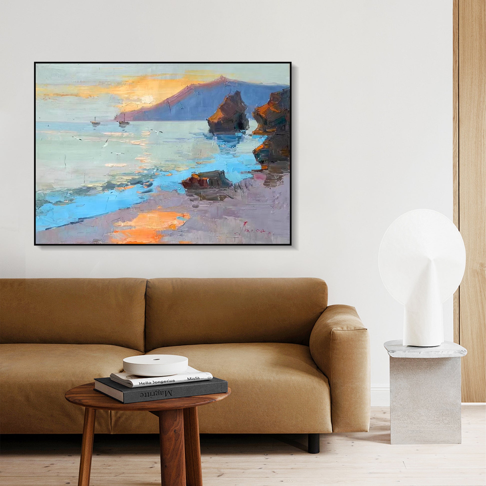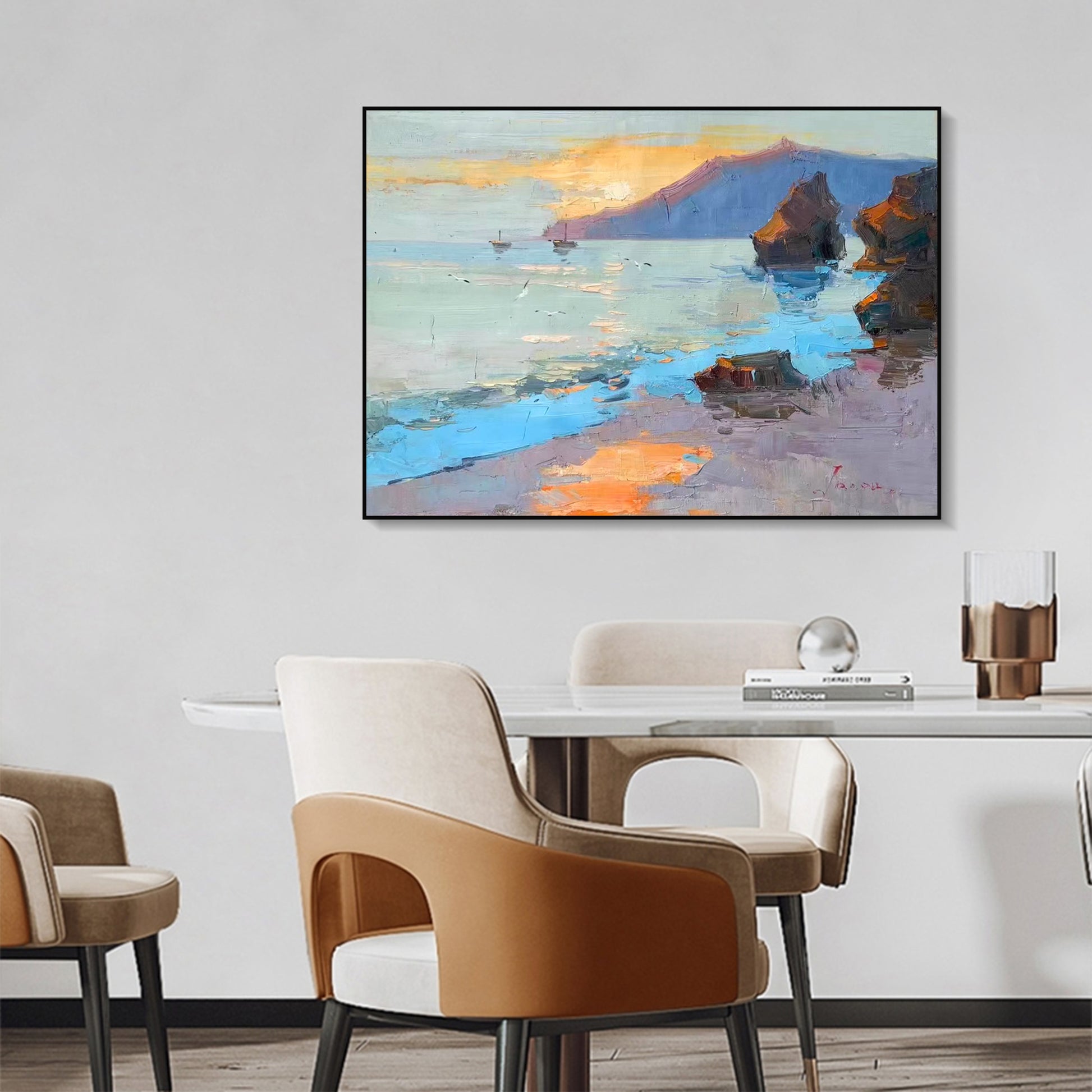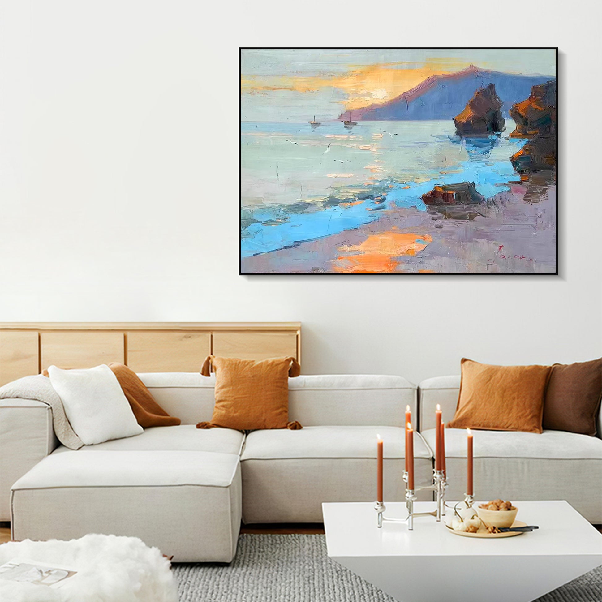 Immerse yourself in the serene ambiance of oceanic artistry as vibrant color expression and intricate details transport you to a world of coastal painting. Whether displayed in your living room, bedroom, or office, landscape painting, afterglow, and hand artworks serve as a captivating focal point, infusing your space with warmth and elegance. Elevate your interior decor with this timeless landscape art, a harmonious fusion of artistry and serenity. Perfect for those who seek to bring the beauty of the coast into their homes, landscape patining, afterglow, hand artworks is more than just a painting—it's a reflection of the endless possibilities that await beyond the shore.