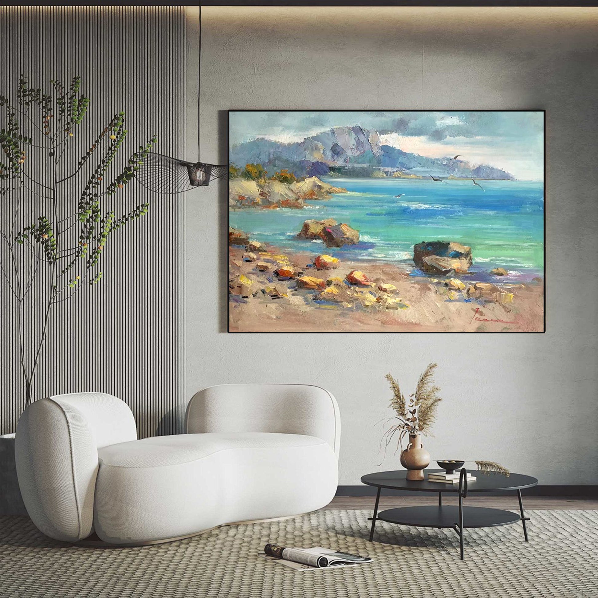 Elevate your interior decor with this exquisite masterpiece, a harmonious blend of artistry and coastal charm. Perfect for those who seek to bring the beauty of the coastal art into their homes, "LANDSCAPE PAINTING, COASTAL VIEW WITH SEAGULL, HAND-PAINTED CANVAS" is more than just a painting—it's a reflection of the endless possibilities that await along the shoreline.