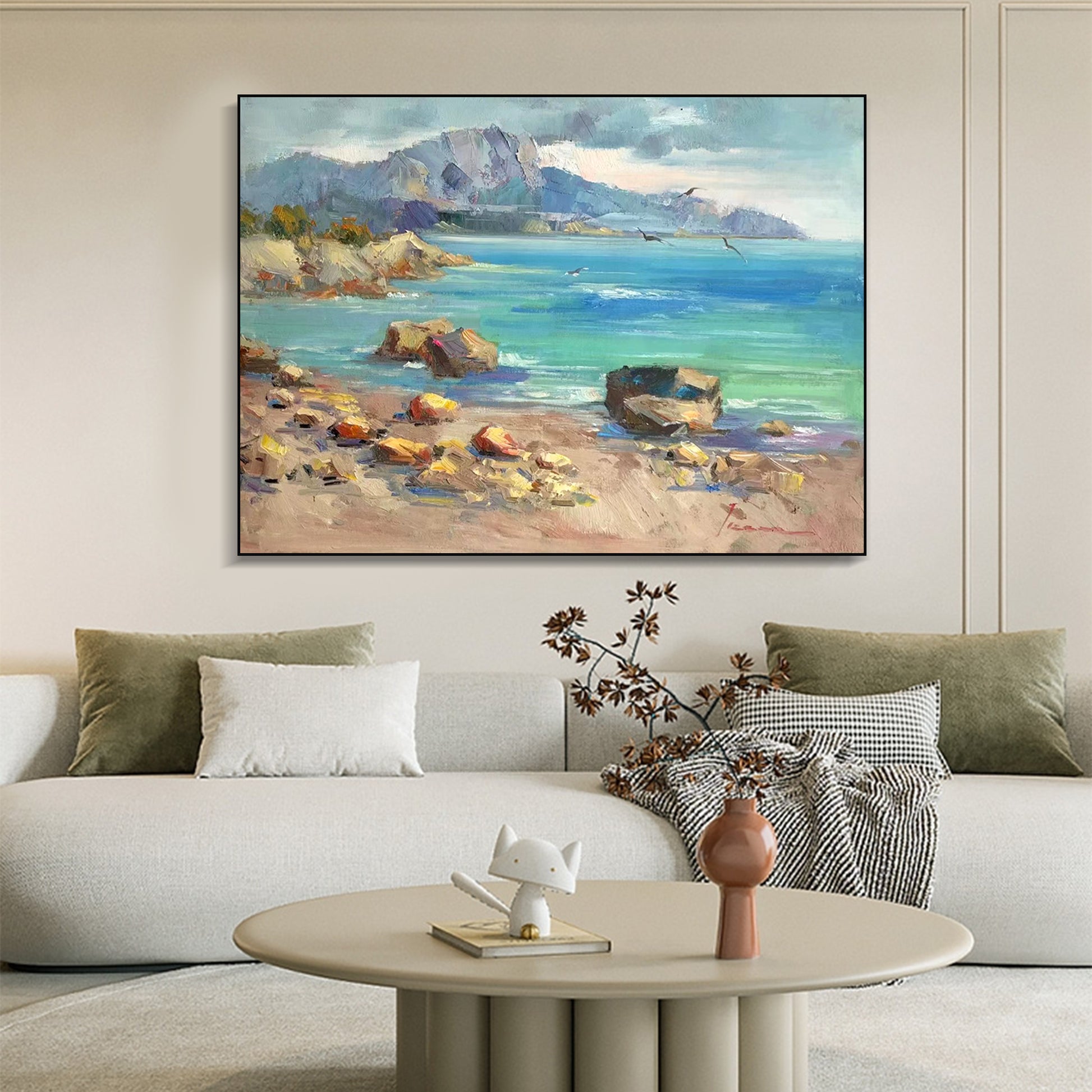 Immerse yourself in the vibrant hues and intricate details of coastal art as you embark on a journey of exploration and discovery. Whether displayed in your living room, study, or bedroom, "LANDSCAPE PAINTING, COASTAL VIEW WITH SEAGULL, HAND-PAINTED CANVAS" serves as a timeless reminder of the soothing rhythms of the sea, infusing your space with a sense of calm and rejuvenation.