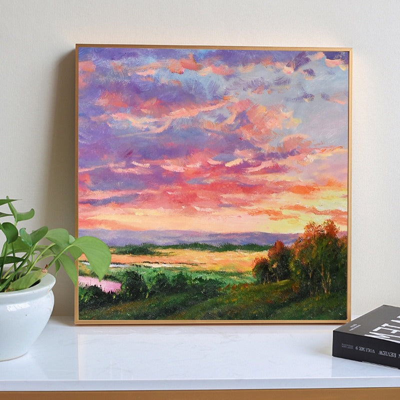 "PINK SUNSET," a stunning landscape painting, captures the ethereal beauty of a sky painted in soft shades of lavender and pink. This piece of wall art is a poetic interpretation of nature's canvas, bringing a sense of tranquility and elegance to living room decorations.