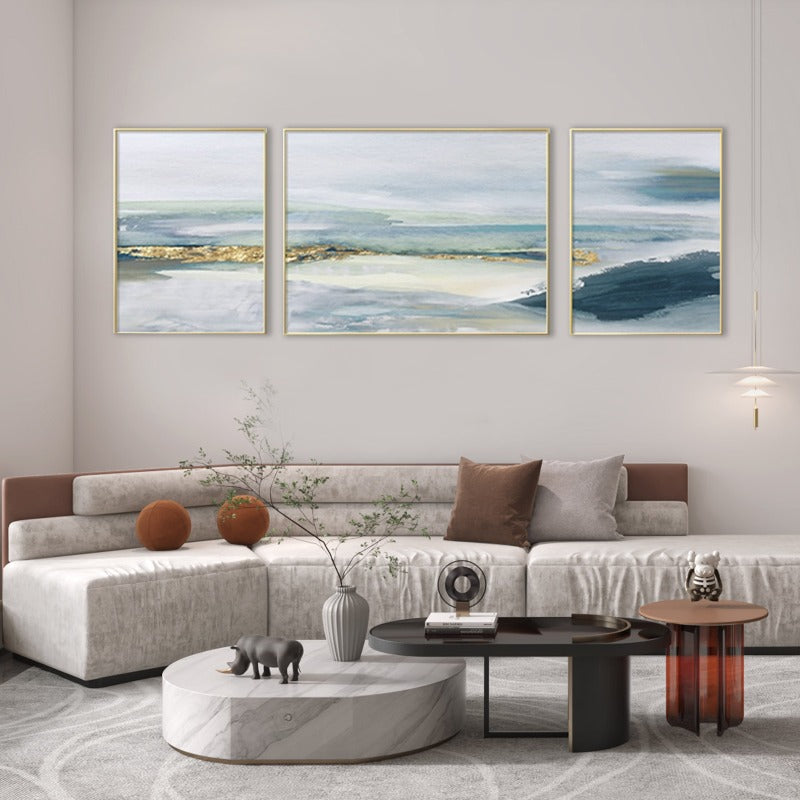 This set of three hand-painted canvases makes an ideal addition to any home decor. Rich with aquatic abstract artwork, the Wave Land collection provides a vivid representation of complex motion and energy, with the perfect balance of light and shadow. An investment in interior decoration, the paintings bring depth and sophistication to any room.
