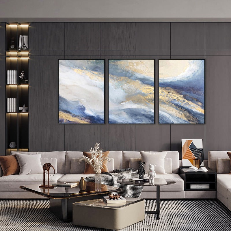 This set of three hand-painted canvases bring an elegant aesthetic to any room. Crafted with navy and gold marble detailing, the artworks make an impactful statement without overpowering the space. Their durable construction ensures a long-lasting beauty.